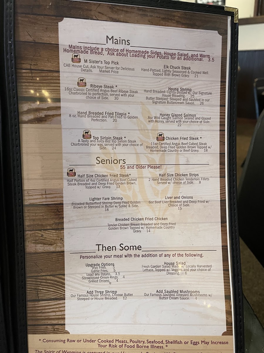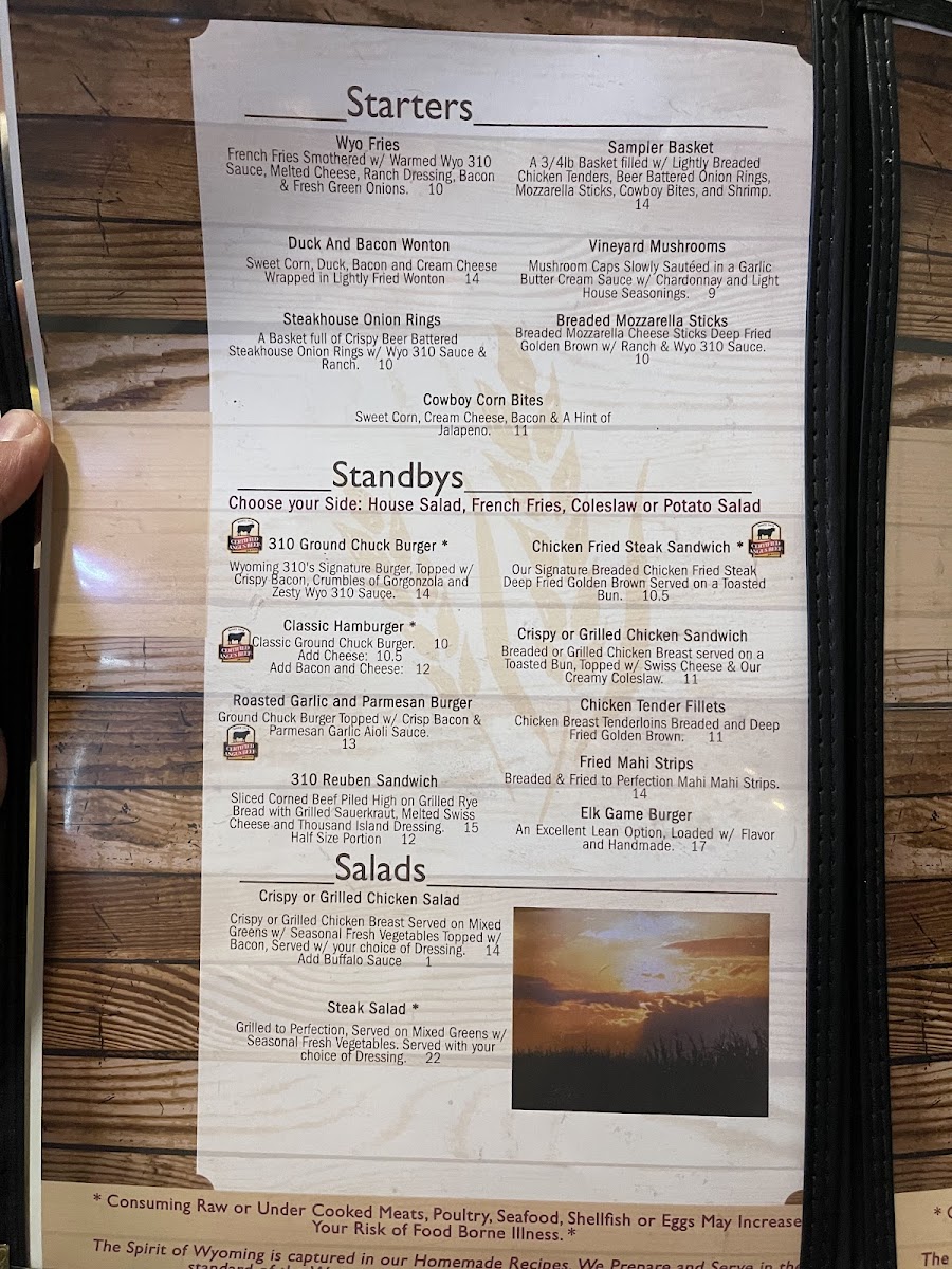 The menu at Wyoming 310 offers a straightforward, hearty selection that reflects the welcoming, rustic charm of this American restaurant. It’s a place where you can settle in for a satisfying meal whether you’re looking for a classic steakhouse experience or something a little lighter and familiar.